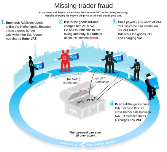 Keywords: Carrouselfraude.svg en An illustration of missing trader fraud also known as carousel fraud in Dutch English and German per SVG switch nl Een illustratie van btw-carrouselfraude unknown ; SVG 2016-01-20 own based PDF export and reworked; http //www belastingdienst nl/wps/wcm/connect/bldcontentnl/belastingdienst/zakelijk/btw/zakendoen_met_het_buitenland/btw_carrouselfraude/btw_carrouselfraude original Belastingdienst Dutch Tax and Customs Administration ; derivative User Perhelion <br> Eng and Deu translation mainly Woodcutterty other versions File Carrouselfraude png other fields + Translate yes Commons cc-zero Tax evasion SVG diagrams in Dutch SVG diagrams in German SVG diagrams in English LicenseReview http //www belastingdienst nl/wps/wcm/connect/bldcontentnl/belastingdienst/zakelijk/btw/zakendoen_met_het_buitenland/btw_carrouselfraude/btw_carrouselfraude Natuur12 2016-01-15 |