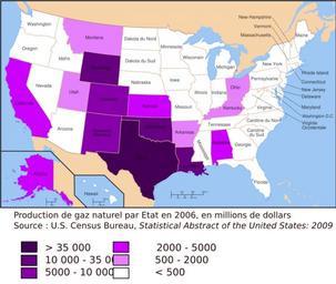Keywords: Carte gaz USA 2006.svg fr carte de la production de gaz naturel aux Etats-Unis en 2006 en milliards de dollars Source Carte de la production de minerais hors hydrocarbures aux Etats-Unis par Etat en 2007 Source U S Census Bureau Statistical Abstract of the United States 2009 http //www census gov/compendia/statab/2009edition html Section Natural Resources Own Urban 2009-04-23 Maps of natural gas production Economic maps of the United States
