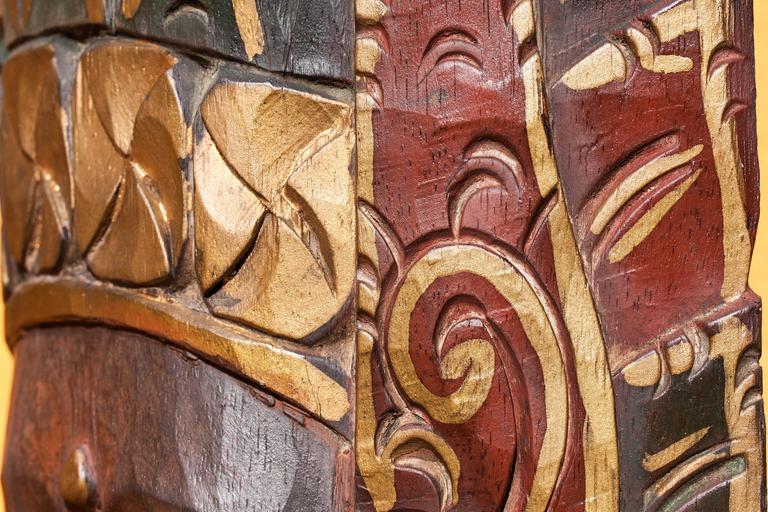 Keywords: carving ornaments temple guardian bali wood painted carved wood carving red green gold art artwork statue head headdress