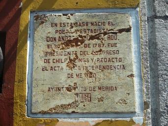 Keywords: Casa de Andrés Quintana Roo, Mérida, Yucatán (01).jpg 20 968808 -89 623392 es Placa conmemorativa que señala donde estuvo la casa donde nació Andrés Quintana Roo 2012-02-13 own Inri FoP-Mexico El texto dice EN ESTA CASA NACIO EL POETA Y ESTADISTA DON ANDRES QUINTANA ROO EL 30 DE NOVIEMBRE DE 1787 FUE PRESIDENTE DEL CONGRESO DE CHILPANCINGO Y REDACTO EL ACTA DE INDEPENDENCIA DE MEXICO AYUNTAMIENTO DE MERIDA LOGOTIPO DEL AYUNTAMIENTO DE MÉRIDA 1979-1981 cc-zero Uploaded with UploadWizard History of Yucatán Plaques in Mexico Houses in Mérida Yucatán |