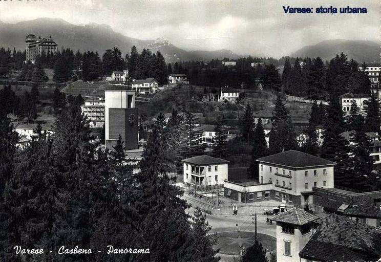Keywords: Al centro piazza Libertà , a destra emerge la torre della questura (ex palazzo del Littorio dell'ing. Mario Loreti, 1933). In alto, sul colle Campigli la massiccia mole del Grand Hotel Palace. varese casbeno