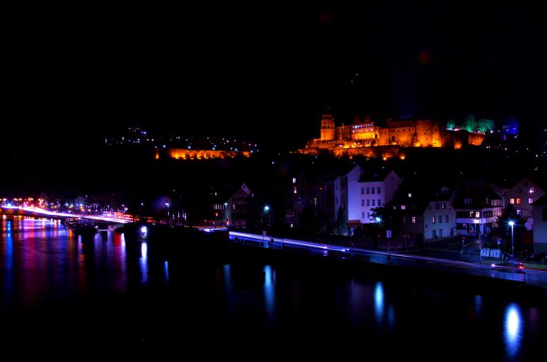 Keywords: castle heidelberg night baden württemberg old bridge lighting historically river historical city evening