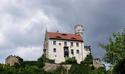 Keywords: castle hotel middle ages visit swiss francs bavaria places of interest holiday sky clouds dark trees tower germany
