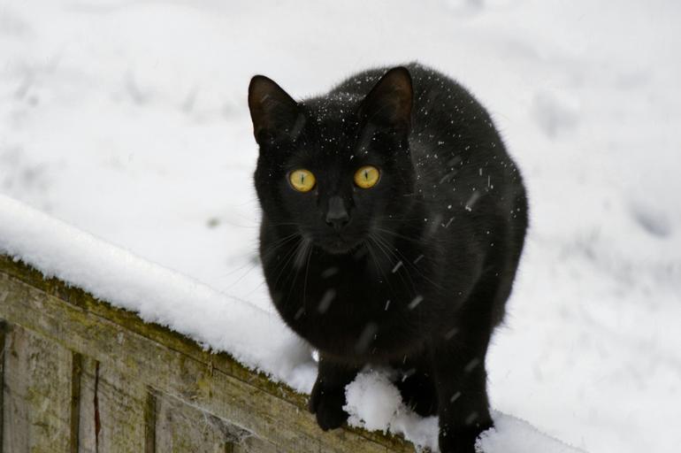 Keywords: cat black kitty domestic feline pet kitten mammal cute halloween snow outdoors winter looking friend companion