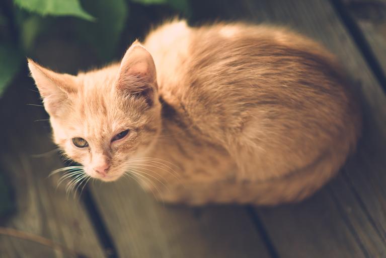 Keywords: cat eye injury one eye village illness vintage wooden outdoor animal pet cute young little unhappy small family domestic red fur portrait nature garden poor