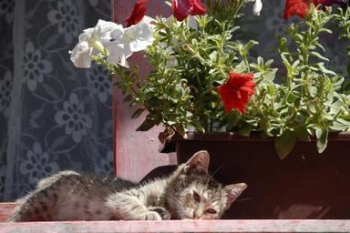 Keywords: cat flower sun laying summer warm flower bed
