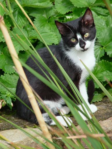 Keywords: cat grass black and white animal nature looking