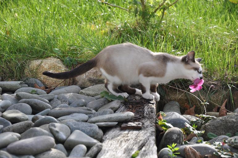 Keywords: cat kitten flower pet cute feline petit animal cosmos japanese cosmos grass pebble wood pink green spring flowering