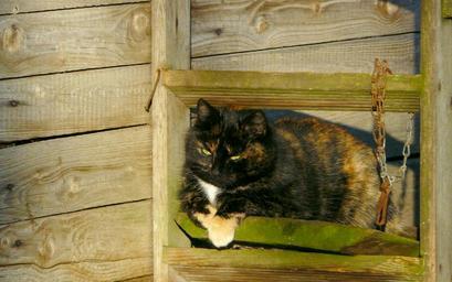 Keywords: cat pet domestic cat animal world animal animals retired colorful coat relaxed lying dormant chain iron chain metal old rusted rusty wood links of the chain
