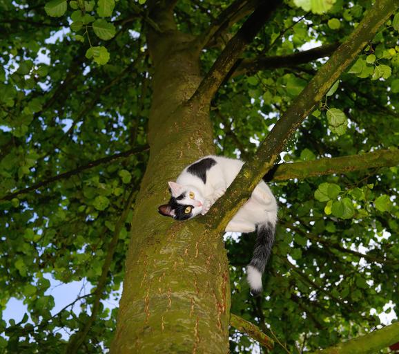 Keywords: cat tree climb young cat pet nature cat in the tree domestic cat in the free curious playful animal animal world black and white fur adidas