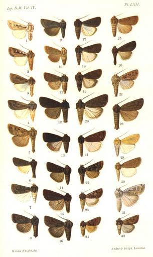 | Keywords: CATALOGUE-BM-LXII.jpg en PLATE LXII 1 Euxoa biclavis m Vol IV p 213 Arizona H10899 Protogygia biclavis Grt 1879 2 E hollemani m p 213 California H10820 Euxoa E hollemani Grt 1874 3 E collocata f p 214 Colorado H10768 Euxoa E atristrigata Sm 1890 4 E nevada m p 214 California H10769 Euxoa E nevadaa Sm 1900 5 E submolesta m p 215 Tibet 6 E flaviscapula m p 216 New Mexico H10805 Euxoa E tessellata Harr 1841 7 E candida m p 216 Montana H10766 Euxoa E misturata Sm 1890 8 E sponsa f p 217 Washington H10785 Euxoa E infausta Wlk 1865 9 E loya f p 217 California H10787 Euxoa E loya Sm 1900 10 E bicollaris m p 218 California H10788 Euxoa E bicollaris Grt 1878 11 E excogita f p 218 Colorado H10787 Euxoa E loya Sm 1900 a excogita Sm 1900 n stat 12 E punctigera m p 219 Vancouver H10787 Euxoa E punctigera Wlk 1865 13 E perpolita f p 219 Massachusetts H10865 E Orosagrotis perpolitaa Morr 1900 14 E finis f p 219 Montana H10805 Euxoa E tessellata Harr 1841 15 E perfusca m p 220 Washington H10786 Euxoa E satis Harv 1876 16 E fumalis m p 220 New York H10781 Euxoa E fumalis Grt 1873 17 E velleripennis m p 220 New York H10803 Euxoa E velleripennis Grt 1874 18 E atomaris m p 22l Colorado H10726 E Pleonectopoda atomaris Sm 1890 19 E atrofusca m p 222 Washington H10805 Euxoa E tessellata Harr 1841 20 E stigmatilis f p 222 Arizona H10805 Euxoa E stigmatalis Sm 1900 21 E gagates m p 223 Massachusetts H10738 Euxoa E mimallonis Grt 1873 22 E falclandica m p 224 Falkland Is 23 E misturata f p 224 Colorado H10766 Euxoa E misturata Sm 1890 24 E moerens m p 224 Colorado H10847 Euxoa E moerens Grt 1883 25 E robiginosa f p 225 Syria 26 E exculta m p 225 Br Columbia H10865 E Orosagrotis perpolita Morr 1876 27 E cursoriodes m p 226 Syria 28 E cremioides m p 227 Hawaii 29 E citricolor m p 227 Colorado H10805 Euxoa E citricolor Grt 1880 30 E viguraea m p 661 Mongolia 31 E remota f p 228 California H10805 Euxoa E tessellata Harr 1841 32 E detersa m p 229 Canada H10838 Euxoa E detersa Wlk 1856 CATALOGUE OF THE NOCTUIDAE IN THE COLLECTION OF THE BRITISH MUSEUM Sir GEORGE F HAMPSON Bart 1903-1913 PD-old Catalogue of Lepidoptera Phalaenae in the British Museum Vol 4 |