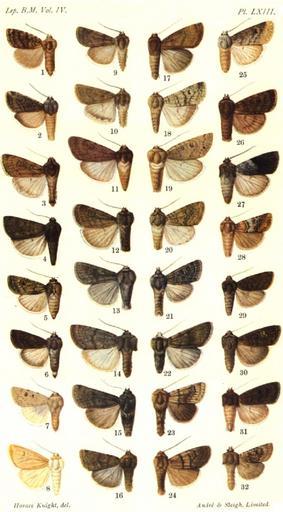 | Keywords: CATALOGUE-BM-LXIII.jpg en PLATE LXIII 1 Euxoa luteola f Vol IV p 229 Arizona H10847 E E moerens Grt 1883 2 E fulda f p 230 California H10705 E Longivescia messoria Harr 1841 3 E naevula m v 230 California H10777 E E acornis Sm 1895 a alko Stkr 1899 4 E termessa m p 231 Wyoming H10777 E E acornis Sm 1895 a alko Stkr 1899 5 E detesta f p 281 Washington H10726 E Pleonectopoda atomaris Sm 1890 a detesta Sm 1893 6 E homicida m p 232 Asia Minor 7ยท E contagionis m p 232 Washington H10809 E E catenula Grt 1879 8 E tronella m p 232 Utah H10842 E E tronella Sm 1903 9 E subdecora m p 233 W Turkestan 10 E acornis m p 233 Br Columbia H10777 E E acornis Sm 1895 11 E caenis f p 234 Colorado H10738 E E mimalonis Grt 1873 12 E relaxa m p 235 California H10785 E E infausta Wlk 1865 13 E vulpina m p 235 Br Columbia H10780 E E comosa Morr 1876 a lutulenta Sm 1895 14 E bostoniensis m p 235 Massachusetts H10812 E E bostoniensis Grt 1874 15 E sessile m p 236 Colorado H10777 E E acornis Sm 1895 a alko Stkr 1899 16 E testula m p 236 Br Columbia H10777 E E acornis Sm 1895 17 E tocoyae m p 237 California H10745 E E tocoyae Sm 1900 18 E audentis m p 237 Colorado H10784 E E lineifrons Sm 1890 19 E medialis m p 238 Colorado H10813 E E medialis Sm 1888 20 E feniseca m p 238 California H10725 E Pleonectopoda fuscigera Grt 1874 21 E difformis m p 239 Oregon H10845 E E difformis Sm 1900 22 E vallus f p 242 Br Columbia H10709 E Pleonectopoda vallus Sm 1900 23 E luteosita m p 242 Colorado H10710 E Pleonectopoda luteosita Sm 1900 24 E bifasciata m p 243 Arizona H10796 E E bifasciata Sm 1888 25 E brocha f p 244 Colorado H10913 Crassivesica bocha Morr 1874 26 E psammophaea m p 246 Hawaii 27 E sculptilis m p 246 New Mexico H10815 E E sculptilis Harv 1875 28 E murdoci m p 247 California H10846 E E murdocki Sm 1890 29 E friabilis f p 249 Canada H10705 E E messoria Harr 1841 30 E nictopis m p 250 Kashmir 31 E intrita m p 251 Vancouver H10749 E E intrita Morr 1874 32 E rubefactalis m p 252 Washington H10785 E E infausta Wlk 1865 CATALOGUE OF THE NOCTUIDAE IN THE COLLECTION OF THE BRITISH MUSEUM Sir GEORGE F HAMPSON Bart 1903-1913 PD-old Catalogue of Lepidoptera Phalaenae in the British Museum Vol 4 |