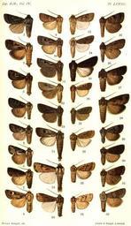 Keywords: CATALOGUE-BM-LXVIII.jpg en PLATE LXVIII 1 Feltia robustior m Vol IV p 341 Canada H10650 Agrotis robustior Sm 1899 2 F subgothica m p 345 Canada H10674 Haw 1809 3 F herilis m p 346 Canada H10676 Grt 1873 4 F honesta m p 347 Mongolia 5 F gravis m p 347 California H10653 Agrotis gravis Grt 1874 6 F vancouverensis m p 348 Vancouver H10652 Agrotis vancouverensis Grt 1873 7 F volubilis m p 349 New York H10659 Agrotis volubilis Harv 1874 8 F pexa m p 349 Patagonia 9 F aeneipennis m p 350 California H10657 Agrotis aeneipennis Grt 1876 10 F duo-signa m p 350 Kashmir 11 F xiphias m p 351 Hawaii 12 F dislocata m p 351 Hawaii 13 F aulacias m p 352 Hawaii 14 F informis m p 352 Japan 15 F malefida m p 353 New York H10661 Agrotis malefida Gn 1852 16 F annexa m p 354 Georgia H10664 Agrotis subterranea F 1794 17 F canities m p 355 Argentina 18 F experta m p 356 Peru 19 F clerica m p 356 Chili 20 Hermonassa spilota m p 359 Bengal 21 H lanceola m p 360 Sikhim 22 H incisa f p 359 Sikhim 23 H clava m p 361 W China 24 H pullidula m p 362 W China 25 Agrotis badinodis m p 364 New York H10955 Xestia badinodis Grt 1874 26 A opacifrons m p 367 New York H10988 Eugraphe subrosea Steph 1829 a opacifrons Grt 1878 27 A spina m p 367 Victoria H 28 A tociensis m p 370 Japan 29 A geniculata m p 370 Massachusetts H10680 Feltia geniculata G R 1868 30 A plana m p 371 W China 31 A cissigma m p 372 W Siberia 32 A violaris m p 372 Pennsylvania H10810 Euxoa E violaris G R 1868 CATALOGUE OF THE NOCTUIDAE IN THE COLLECTION OF THE BRITISH MUSEUM Sir GEORGE F HAMPSON Bart 1903-1913 PD-old Catalogue of Lepidoptera Phalaenae in the British Museum Vol 4