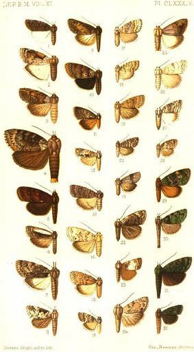 | Keywords: CATALOGUE-BM-PLATE CLXXXIV.jpg en PLATE CLXXXIV 1 Iscadia niqra f Vol XI p 362 Argentina 2 I ducinfieldia f p 364 Brazil 3 I producta f p 365 Trinidad 4 I bucleyi m p 366 Ecuador 5 I phaeoptera m p 367 Brazil 6 Elaeognatha argyroleuca f p 371 Fr Guiana 7 E nitescens f p 373 Peru 8 E argyritis f p 373 Panama 9 E purpurascens m p 374 Peru 10 E cacaonis f p 375 Trinidad 11 Calathusa hypotherma f p 379 Queensland 12 C ischnodes f p 380 Queensland 13 C octogesima f p 380 Queensland 14 C abebaea f p 381 Queensland 15 C subflavida f p 381 Queensland 16 C stenophylla m p 382 Queensland 17 C dispila m p 383 Queensland 18 C mesospila m p 383 Queensland 19 C metableta m p 384 Queensland 20 C eremna m p 384 Queensland 21 C delosticha m p 385 Queensland 22 Aquis aquisoides m p 386 Assam 23 A albida m p 387 Borneo 24 Barasa cymatistis m p 390 Queensland 25 B griseola m p 390 New Guinea 26 B costalis f p 392 Bhuta'n 27 B tetragramma f p 392 Fiji 28 B basigerella f p 392 Flores 29 Labanda huntei f p 394 New Guinea 30 L viridalis m p 395 Assam 31 L saturalis m p 396 Travancore 32 L dentilinea m p 398 Borneo CATALOGUE OF THE NOCTUIDAE IN THE COLLECTION OF THE BRITISH MUSEUM Sir GEORGE F HAMPSON Bart 1903-1913 PD-old Catalogue of Lepidoptera Phalaenae in the British Museum Vol 11 |