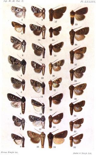 | Keywords: CATALOGUE-BM-PLATE LXXXVI.jpg en PLATE LXXXVI 1 Discestra florida m Vol V p 15 Florida H10257 Trichoclea florida Sm 1900 2 Craterestra semifusca f p 22 Uganda 3 Scotogramma hadeniformis f p 30 Colorado H10237 Trudestra hadeniformis Sm 1894 4 Anarta etacta f p 41 Alaska H10330 Sm 1900 5 Polia naevia m p 65 Colorado H10381 Lacinipolia naevia Sm 1898 6 P languida m p 69 Colorado H10280 P purpurissata Grt 1864 7 P griseata f p 74 Colorado H10381 Lacinipolia naevia Sm 1898 8 P gnata m p 86 Arizona H10375 Lacinipolia gnata Grt 1882 9 P dilatata f p 118 New Mexico H10416 Lacinipolia illaudabilis Grt 1875 10 P variolata m p 118 Washington H10326 Miselia variolata Sm 1888 11 P glaciata m p 119 Arizona H10325 Miselia glaciata Grt 1882 12 P roseosuffusa m p 189 Arizona H10389 Lacinipolia roseosuffusa Sm 1900 13 P vittula f p 183 New Mexico H10380 Lacinipolia vittula Grt 1882 14 P incurva m p 184 New Mexico H10373 Lacinipolia incurva Sm 1888 15 P intentata m p 184 Colorado H10379 Lacinipolia umbrosa Sm 1888 16 Chabuatta punctosa m p 264 Australia 17 Hyssia sminthistis m p 280 New Zealand 18 H niveiguttata m p 288 California H10575 Ulolonche niveiguttata Grt 1873 19 H orbiculata m p 289 Colorado H10574 Ulolonche orbiculata Sm 1891 20 H musculina m p 289 Syria 21 Proteinania achatioides m p 290 Brazil 22 Eriopyga crocosticta m p 292 Mexico 23 E mulina m p 293 Mexico 24 E baruna m p 294 Brazil 25 E mediorufa f p 295 Brazil 26 E contempta m p 295 Costa Rica 27 E curtica m p 296 Colorado H10546 Protorthodes curtica Sm 1890 28 E acalus f p 296 Colorado H10548 Protorthodes akalus Stkr 1898 29 E incincta m p 297 Colorado H10552 Protorthodes incincta Morr 1874 30 E perfusca m p 299 Mexico 31 E melanopis m p 299 Arizona H10566 Protorthodes melanopis Hamp 1905 32 E orobia m p 299 Texas H10565 Protorthodes orobia Harv 1876 CATALOGUE OF THE NOCTUIDAE IN THE COLLECTION OF THE BRITISH MUSEUM Sir GEORGE F HAMPSON Bart 1903-1913 PD-old Catalogue of Lepidoptera Phalaenae in the British Museum Vol 4 |