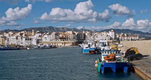 Keywords: catalonia spain bay harbor water ships boats buildings shoreline sky clouds outside mountains architecture city