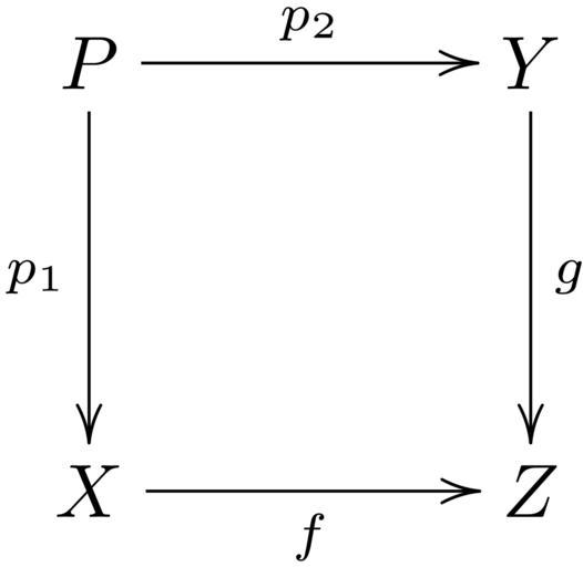 | Keywords: Categorical pullback.svg en The commutative square for a categorical pullback of two maps Own Ryan Reich 2009-01-14 File CategoricalPullback-03 png LaTeX source <pre> \documentclass amsart \usepackage amsmath amssymb nopageno \usepackageall xy \begin document \begin equation \xymatrix C+2em R+2em P \ard_ p_1 \arr p_2 Y \ard g \\ X \arr_ f Z \end equation \end document </pre> Commutative squares Images with LaTeX source code | ||||