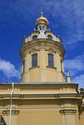 Keywords: cathedral building soft yellow architecture tower rotund cupola gold detail arches ledges sky blue