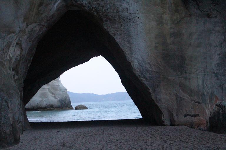 Keywords: cathedral cove new zealand north island landscape nature volcanic coast coromandel peninsula water volcanism travel evening sea scenic rest holiday abendstimmung dark beach mood light sand sand beach summer atmosphere maritime