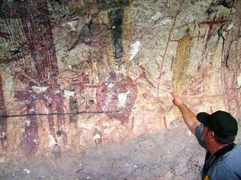 Keywords: Pre-historic pictographs adorn a large rock shelter in Amistad National Recreational Area. (NPS Photo) caves national area recreation archeology amistad pictographs