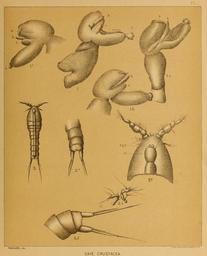 Keywords: Cave Fauna of North America Plate 01.jpg en Plate I Fig 1 Cauloxenus stygius Cope ” 1a 1b 1c the same in different positions ; a b antennae ; c mandible ; x point of attachment of arms to its host Highly magnified Fig 2 Canthocamptus cavernarum Pack ” 2a head showing the antennules and antenna ; st stomach ; 2b the second antennae more magnified ; 2c end of the body dorsal view ; 2d the same enlarged Author del 1888 Packard A S 1888 https //archive org/details/cavefaunaofnorth00pack The cave fauna of North America with remarks on the anatomy of the brain and origin of the blind species Washington National Academy of Sciences Alpheus Spring Packard other versions PD-old-70-1923 Uploaded with UploadWizard The Cave Fauna of North America Copepoda |