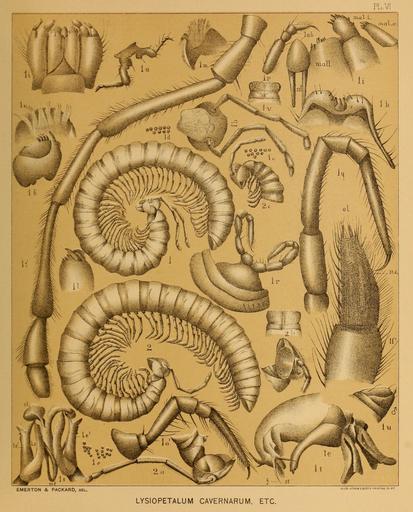 Keywords: Cavefaunaofnorth00pack 0179.jpg en Plate VI Fig 1 Pseudotremia cavernarum Cope from Wyandotte Cave enlarged ” 1a head; 1b the same front view; 1d eyes Emerton del 1e eyes of a Wyandotte Cave specimen; 1f antenna much enlarged ; 1f' terminal joint highly magnified filled with nerve cells with numerous tactile setae and two tactile or olfactory rods at the end; 1g under lip or dentomala compare PI VIII fig 1f and explanation ; 1h labrum with the three central teeth; 1i external malella mal e internal malella mal i and labiella lab ; 1k mandible of one side; 1m the same on the other side ; 1n six bundles of setae on the free edge of lm; 1o eighth pair of legs; 1o' one of the legs enlarged; 1p a leg of the first pair next to the head ; 1q a leg of the last pair; 1r a pair of normal legs; 1s male genital armature ; 1t the same different view ; 1u end of the body ; 1v a segment dorsal view Author del Fig 2 P cavernarum var carterensia Pack enlarged ” 2a head enlarged; 2b side view of another specimen x6; 2c dorsal view of a segment Emerton del 1888 Packard A S 1888 https //archive org/details/cavefaunaofnorth00pack The cave fauna of North America with remarks on the anatomy of the brain and origin of the blind species Washington National Academy of Sciences 1888 James Henry Emerton and Alpheus Spring Packard other versions PD-old-70-1923 Uploaded with UploadWizard Diplopoda anatomy Pseudotremia The Cave Fauna of North America |