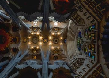 Keywords: ceiling cathedral sagrada família barcelona catalonia architecture church inside structure colossal religion construction light materials inside cathedral perspective cathedral ceiling lights