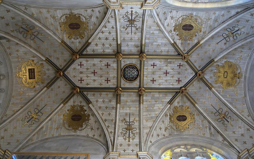 Keywords: Ceiling chapelle Chantilly.jpg Château de Chantilly 1889 stone Museum Musée Condé object history Voûte de la chapelle Commande faite en 1889 par le Duc d'Aumale à Lechevallier-Chevignard qui réalisa les cartons et à Guifard qui exécuta les compositions Vault of the chapel of the castle Ordered in 1889 by duke of Aumale Designed by Lechevallier-Chevillard painted by Guiffard credit line Achat L'ensemble fut payé 1685 frs purchase 1685 francs Montjoie Saint-Denys; Spes mea Deus; Dieu protège la France accession number 00000104768 Jebulon for photograph 49 11 36 9 N 2 29 8 4 E cc-zero Uploaded with UploadWizard Chapelle du Château de Chantilly Church ceilings in Picardie Azure semé-de-lys or Latin mottos Crowns in art Swords in architecture Sceptres in art Fleur-de-lis in art Main de justice in art Quality images by Jebulon Quality images of Oise QualityImage