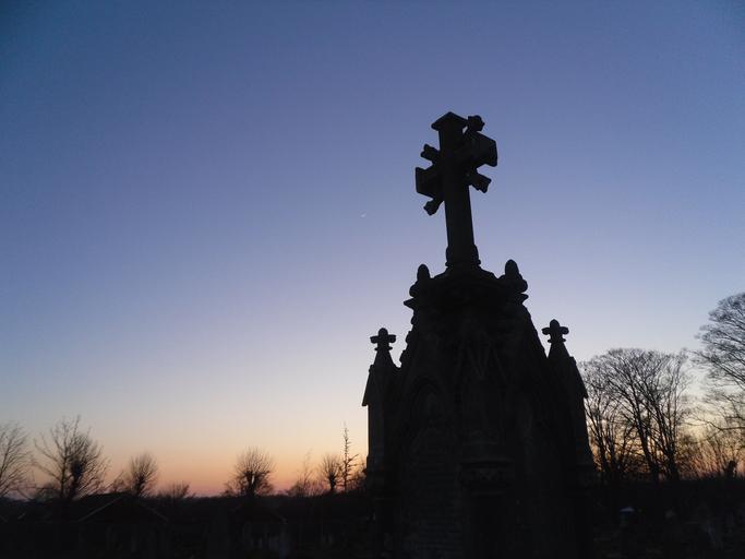 Keywords: cemetery stone silhouette shape evening sky grave graveyard tombstone tomb gravestone funeral religion religious