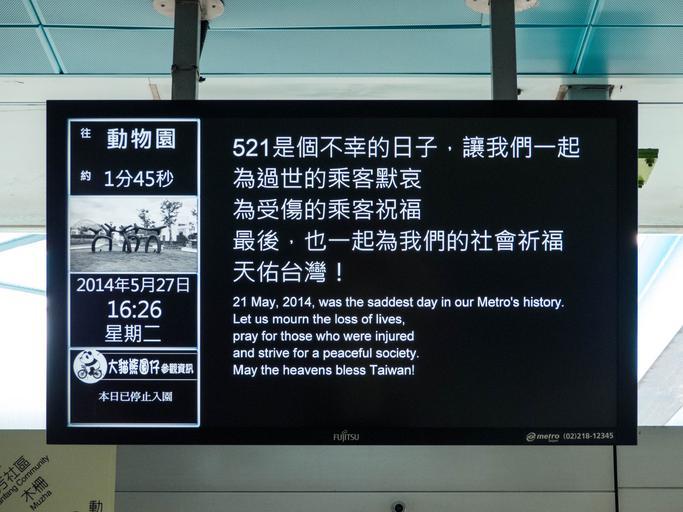 | Keywords: Cenotaph Screen Shot of Taipei Metro Banqiao Line Attack 7th Days 20140527.jpg zh-tw 臺北捷運 橋線隨機殺人事件頭七,2014年5 27日下午4時26分至31分間,臺北捷運公司於北捷全線車站 臺489 液晶電視,同時播放無聲字卡,為死 默 傷 祈福 於捷運中山 中站南下 臺 2014-05-27 16 30 30 Own 玄史生 2014 Taipei Metro Banqiao Line Attack Liquid crystal displays at train stations Zhongshan Junior High School Station 玄史生写 文庫 Taken with Leica V-Lux 4 Uploaded with UploadWizard Fujitsu cc-zero | ||||