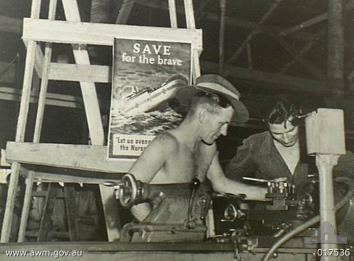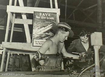 | Keywords: Centaur poster Lae (AWM 017536).jpg en AWM Caption New Guinea 15 September 1944 A second Victory War Loan poster reading 'Save for the brave Let us avenge the Nurses' which had been displayed in one of the workshops at Lae Corporal E Johnston of Camberwell Vic wearing hat and Staff Sergeant S Steward of Fitzroy Vic are working at the lathe The poster depicts the hospital ship Centaur which was sunk on 14 May 1943 off Point Lookout Qld 017536 The AWM record for this photo states that the copyright status is 'clear' The photo was taken in 1944 PD-Australia Original upload log en wikipedia FtCG page en wikipedia Centaur_poster_Lae_ AWM_017536 jpg wikitable - 02 09 24 May 2007 450 × 332 67 051 bytes Nick-D w en <nowiki> Australian War Memorial AWM catalog number 017536 Sourced from http //www awm gov au/database/collection asp Copyright The AWM record for this photo states that the copyright status is 'clear' The photo was taken in 1944 The AWM allow </nowiki> Military history of Australia during World War II Black and white photographs |