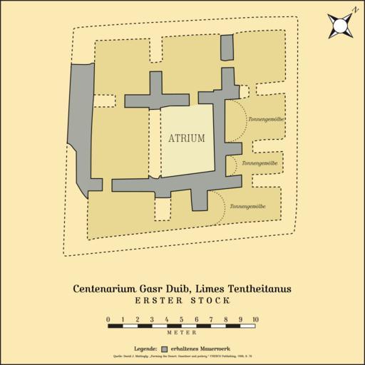 | Keywords: Centenarium Gasr Duib, erster Stock.svg de Centenarium Gasr Duib Zeichnung der erhaltenen Baureste des ersten Stocks am burgusartigen Gasr Duib in der Region des Oberen Sofeggin Libyen Berücksichtigt sind die nachrömischen Ein- bzw Umbauten aus islamischer Zeit Quelle David J Mattingly Farming the Desert Gazetteer and pottery UNESCO Publishing 1996 S 76 own Mediatus 12 02 2015 Cc-zero Limes Tripolitanus | ||||