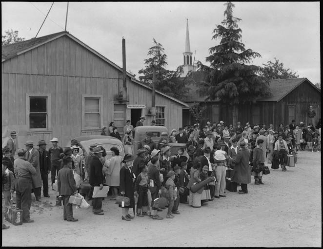 | Keywords: Centerville, California. Members of farm families await evacuation bus. Farmers and other evacuees . . . - NARA - 537574.jpg Scope and content The full caption for this photograph reads Centerville California Members of farm families await evacuation bus Farmers and other evacuees of Japanese ancestry will be given opportunities to follow their callings at War Relocation Authority centers where they will spend the duration General notes 537574 Local identifier 210-G-C227 Department of the Interior War Relocation Authority 02/16/1944 - 06/30/1946 NARA-Author Lange Dorothea 1895-1965 Photographer 1372774 <br /> Still Picture Records Section Special Media Archives Services Division NWCS-S National Archives at College Park 8601 Adelphi Road College Park MD 20740-6001 1942-05-09 Record group Record Group 210 Records of the War Relocation Authority 1941 - 1989 Record group ARC 537 Central Photographic File of the War Relocation Authority compiled 1942 - 1945 Series ARC 536000 File unit File unit ARC Variant control numbers NAIL Control Number NWDNS-210-G-C227 Other versions <gallery> File Centerville _California _Members_of_farm_families_await_evacuation_bus _Farmers_and_other_evacuees_ _ _ _-_NARA_-_537574 tif tif File Centerville _California _Members_of_farm_families_await_evacuation_bus _Farmers_and_other_evacuees_ _ _ _-_NARA_-_537574 jpg jpg </gallery> NARA-cooperation PD-USGov Japanese American internment processing in Centerville Alameda County California Dorothea Lange |