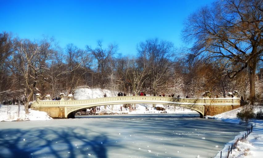 Keywords: central park new york city landmark winter snow ice pond trees city cities urban nature outside bridge architecture