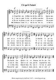 Keywords: Cequelaino.png Music and lyrics of the w fr Cé qu'è lainô the offical anthem of Geneva Music of the w fr Cé qu'è lainô; lyrics for the four stanzas usually sung are also included Typeset by User Schutz using w en Lilypond Original version around 1603; typeset in January 2007 Author The original lyrics and music are in the public domain due to their age musical notation LilyPond source <pre> Cé qu'è l'ainô \header title Cé qu'è l'ainô \paper line-width 15\cm paper-width 17\cm paper-height 25\cm top-margin 0\cm bottom-margin 0 5\cm left-margin 1\cm right-margin 1\cm \relative \time 3/4 \new ChoirStaff << \new Staff << \key g \major \new Voice main \voiceOne \dynamicUp \key g \major d'--\f d-- d-- d4 -- c8 b4 d c b\> a g\ r d'--\f d-- d-- d4 -- c8 b4 d c b\> a g\ r \repeat volta 2 g g a fis4 e8 d4 g4 fis g a2 d4-- d-- d-- b4 a8 g4 c b a g2 \new Voice second \voiceTwo \key g \major d4 d fis g fis g d d d d8 c b4 r d d fis g fis g d d d d8 c b4 r d e e d cis d d d d d2 d4 g fis g f g g g fis d2 >> \new Lyrics \lyricsto main \set stanza 1 Cé qu'è lai -- nô le Maî -- tre dé ba -- tail -- le Que se mo -- qué et se ri dé ca -- nail -- le A bin fai vi pé on De -- san -- de nai Qu'il é -- ti -- vé Pa -- tron dé Ge -- ne -- voi \new Lyrics \lyricsto main \set stanza 2 I son ve -- gnu le do -- ze de Des -- san -- bro Pè on -- na -- nai as -- se nai -- re que d'an -- cro; Y é -- ti -- vé l'an mil si san et dou Qu'i ve -- ni -- ron par -- la on pour troi tou \new Lyrics \lyricsto main \set stanza 4 Pe -- tis et grans o -- ssis an se -- ve -- gnan -- ce Pè on ma -- tin d'on -- na bel -- la de -- man -- ze Et pè on zeur qu'y fas -- si -- ve bin frai Sans le bon Di nos é -- ti -- von to prai \new Lyrics \lyricsto main \set stanza 68 De -- dian sa man il y tin la vic -- toi -- re A lui so -- let en dé -- mu -- re la gloi -- re; A to za -- mai son Sain Non sai be -- gni A -- men A -- men ain -- si ain -- si soit -- y \new Staff << \clef bass \key g \major \new Voice b 4 \f g a b a g b f g f g r b g a b a g b f g f g r b b a a g a g a b f2 b4 d d d c b e d c b2 >> >> \version 2 8 7 </pre> PD-old L'Escalade Franco-Provençal language Images with LilyPond source code |