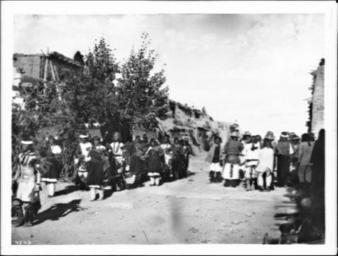 Keywords: Ceremonial procession for the Fiesta de San Esteban, Acoma Pueblo, New Mexico, 1886 (CHS-4548).jpg en <br> Ceremonial procession for the Fiesta de San Esteban Acoma Pueblo New Mexico 1886 Photograph blurred of a procession of dancers and singers at Fiesta de San Esteban Saint Stephen Acoma Pueblo New Mexico 1886 About a dozen dancers left wear traditional garb and dance before the kisi located in the midst of the tree branches and bushes A small crowd of onlookers right stand across the dirt road near the three-story adobe buildings of the pueblo Ladders can be seen leaning against the exterior of the cube-shaped buildings of the pueblo in the background Call number CHS-4548 Legacy record ID chs-m16883; USC-1-1-1-13461 Photographer James George Wharton Filename CHS-4548 Coverage date 1886 Part of collection California Historical Society Collection 1860-1960 Type images Geographic subject city or populated place Acoma Pueblo Repository name USC Libraries Special Collections Accession number 4548 Microfiche number 1-160-48 Archival file chs_Volume96/CHS-4548 tiff Part of subcollection Title Insurance and Trust and C C Pierce Photography Collection 1860-1960 Repository address Doheny Memorial Library Los Angeles CA 90089-0189 Geographic subject country USA Format aacr2 2 photographs glass photonegative photoprint b w ; 17 x 22 cm Rights Digitally reproduced by the USC Digital Library; From the California Historical Society Collection at the University of Southern California Subject adlf tribal areas Project USC Repository email specol usc edu Identifying number unidentified no James-1382 Contributing entity California Historical Society Date created 1886 Publisher of the digital version University of Southern California Libraries Format aat photographic prints; photographs Geographic subject state New Mexico Format glass plate negatives Access conditions Send requests to address or e-mail given Phone 213 821-2366; fax 213 740-2343 Subject file heading Indians -- Acoma Subject lcsh Indians of North America; Acoma Indians Subject Acoma Indians; Acoma; Acoma Indians 1886 date created George Wharton James 1858 1923 http //digitallibrary usc edu/cdm/ref/collection/p15799coll65/id/16805 PD-old-70-1923 Images from USC Digital Library uploaded by Fæ Photographs by George Wharton James California Historical Society Collection 1860-1960 Glass plate negatives Acoma Pueblo 1886 in New Mexico 1886 in dance |