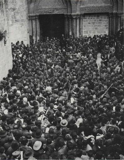 | Keywords: Ceremony of the Holy Fire at the Holy Sepulchre (1905).jpg en Ceremony Of The 'Holy Fire' 1905 Greek Orthodox pilgrims at the entrance to the Church of the Holy Sepulchre awaiting the commencement of the Holy Fire ceremony The Turkish soldiers visible in the photograph attempt to maintain order pl Ceremonia Ognia Świętego Prawosławni pielgrzymi przed wejściem do bazyliki Grobu Świętego Rok 1905 http //www eretzyisroel org/~dhershkowitz/pic205 jpg author 1905 Holy Fire Historical images of Holy Sepulchre PD-old |