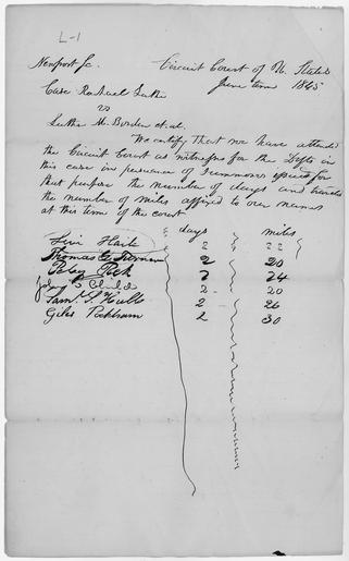 | Keywords: Certification of attendance of witnesses for the defendents in the case of Rachel Luther v. Luther Borden, et. al. - NARA - 278266.tif Scope and content This document is from a suit for trespass against a group of Rhode Island state militia who acting under martial law broke into the home of Martin Luther Rachel Luther's son in the middle of the night searched the premises and threatened Rachel Luther Rachel Luther charged that the charter government which proclaimed martial law was not the legal government of Rhode Island The defendents claimed that the declaration of martial law was legal and that they were acting under the orders of their superior officers when they entered the house to search for Luther who was an important supporter of Thomas W Dorr who had organized a people's government Mrs Luther also questioned whether the charter government had the authority to declare martial law and stated that there were limits on its enforcement The decision of the US Circuit Court in favor of the defendents was appealed to the US Supreme Court The US Supreme Court however feeling that the case was political in nature refused to rule on the issues and returned the case to the US Circuit Court This case was an important case in the historic events commonly known as the Dorr Thomas W Dorr Rebellion General notes 278266 Local identifier U S Circuit Court for the District of Rhode Island 1790 - 01/01/1912 NARA's Northeast Region Boston NRAAB 380 Trapelo Road Waltham MA 02452-6399 ca 06/1845 - ca 06/1845 Record group Record Group 21 Records of District Courts of the United States 1685 - 2004 Record group ARC 350 Case Files compiled 11/1790 - 12/1911 Series ARC 278236 File unit Rachel Luther v Luther Borden et al 10/24/1842 - 12/1848 File unit ARC 2251150 Variant control numbers NAIL Control Number NRAB-21-CASECCRI-6LAW-L yes Other versions NARA-cooperation PD-USGov Luther v Borden |