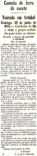 | Keywords: CFS Setubal bullfighting advertisement 3.jpg pt Anúncio do Caminho de Ferro do Sueste em Portugal para comboios especiais a preços reduzidos de Lisboa via fluvial até ao Barreiro até Setúbal para uma tourada Esta imagem foi publicada no Diario Illustrado n º 335 de 27 de Junho de 1873 e digitalizada pela Biblioteca Nacional de Portugal en Advertisement of the Caminho de Ferro do Sueste Portuguese Southeastern Railway for special trains at reduced prices from Lisbon boats to Barreiro to Setúbal for a bullfighting event This image was published on the Diario Illustrado newspaper No 335 of 27th June 1873 and scanned by the Biblioteca Nacional de Portugal 1873-06-23 http //purl pt/14328/1/j-1244-g_1873-06-27/j-1244-g_1873-06-27_item2/j-1244-g_1873-06-27_PDF/j-1244-g_1873-06-27_PDF_24-C-R0150/j-1244-g_1873-06-27_0000_1-4_t24-C-R0150 pdf Caminho de Ferro do Sueste Institution Institution Biblioteca Nacional de Portugal other versions Custom license marker 2015 11 23 Anonymous-EU Public transport information in Portugal Caminho de Ferro do Sueste 1873 in rail transport in Portugal Ferries in Lisbon Linha do Alentejo Linha do Sul Images from the Biblioteca Nacional de Portugal |