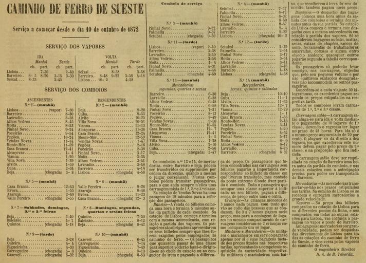 | Keywords: CFS Timetable 1872.jpg pt Horários do Caminho de Ferro do Sueste divisão do governo Português que explorava os comboios do Alentejo até à Margem Sul do Rio Tejo e os navios a vapor desde a Margem Sul até Lisboa Esta imagem foi publicada no Diario Illustrado n º 103 de 11 de Outubro de 1872 e digitalizada pela Biblioteca Nacional de Portugal en Timetable of the Caminho de Ferro do Sueste South Eastern Railway that managed the trains from the Alentejo region to the South bank of the Tagus River and steam ferrys from the South bank to Lisbon in Portugal This image was published on the Diario Illustrado newspaper No 103 of 11th October 1872 and scanned by the Biblioteca Nacional de Portugal 1872-10-11 http //purl pt/14328/1/j-1244-g_1872-10-11/j-1244-g_1872-10-11_item2/j-1244-g_1872-10-11_PDF/j-1244-g_1872-10-11_PDF_24-C-R0150/j-1244-g_1872-10-11_0000_1-4_t24-C-R0150 pdf Caminho de Ferro do Sueste other versions Institution Institution Biblioteca Nacional de Portugal Custom license marker 2015 07 29 Anonymous-EU Uploaded with UploadWizard Train timetables in Portugal Caminho de Ferro do Sueste 1872 in rail transport in Portugal Ferries in Lisbon Linha do Alentejo Linha de Évora Ramal de Moura Linha do Sul Images from the Biblioteca Nacional de Portugal |
