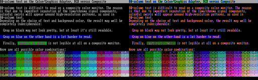 Keywords: CGA CompVsRGB Text.png CGA 80-column text display on RGB vs Composite monitors en wikipedia Tothwolf CommonsHelper 2007-07-24 NewRisingSun wikipedia en Created with the following BASICA code 10 COLOR 7 0 CLS DEFINT A-Z 20 LOCATE 1 1 COLOR 0 7 PRINT 80-column text on the Color/Graphics Adapter RGB versus Composite 30 LOCATE 3 1 COLOR 7 0 PRINT 80-column text is difficult to read on a composite color monitor The reason 40 PRINT is that due to imperfect separation of the luma/chroma signal components 50 PRINT colorful swirls will appear around high-resolution patterns as used in 60 PRINT 80-column text 70 PRINT Depending on the choice of text and background color the result may well be 80 PRINT completely indecipherable PRINT 90 COLOR 7 0 PRINT Gray on black may not look pretty but at least it's still readable PRINT 100 COLOR 7 1 PRINT Gray on blue on the other hand is a lot harder to read PRINT 110 COLOR 7 0 PRINT Finally ; COLOR 5 2 PRINT magenta on green ; COLOR 7 0 PRINT is not legible at all on a composite monitor PRINT 120 PRINT Here are all possible color combinations 130 FOR F 0 TO 15 FOR B 0 TO 7 140 COLOR F B PRINT COLOR ; 150 NEXT B NEXT F 160 X INKEY IF X THEN GOTO 160 NewRisingSun original upload log page en wikipedia CGA_CompVsRGB_Text png 2009-09-09 20 56 NewRisingSun 1280×400× 204828 bytes <nowiki></nowiki> 2007-07-24 23 29 NewRisingSun 1280×400× 181472 bytes <nowiki></nowiki> Computer graphic color codes CGA |