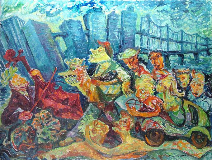 | Keywords: Chaim Goldberg - Mad Drivers by the Bridge.jpg  Mad Drivers by the Bridge oil painting on canvas http //en wikipedia org/wiki/File Mad_Drivers_by_the_Bridge 75 055 jpg 1975 Chaim Goldberg Chaim_Goldberg Art of the United States 1975 paintings |