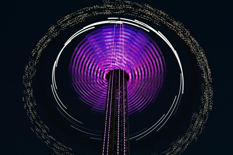 Keywords: chain aviator tower high 80m fair hustle and bustle year market folk festival carnies fairground pleasure fun leisure fun activity colorful entertainment speed color fast sit chains view no fear of heights upward height turn night lights light attraction
