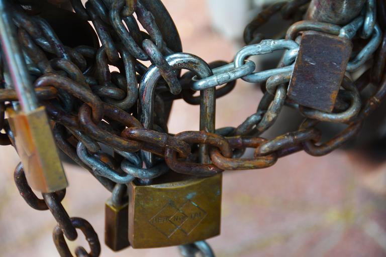 Keywords: chains lock shackle security padlock protection safety metal safe secure locked privacy secret steel link closed protect chain link iron rusty chained strength heavy strong old metallic weathered