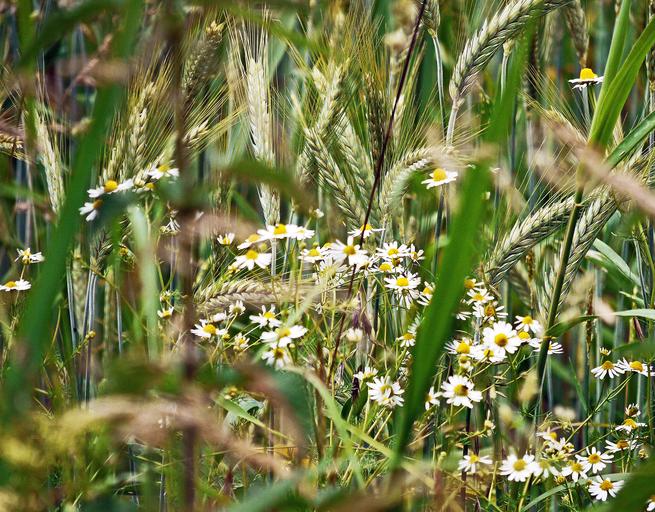 Keywords: chamomile cornfield spike summer foliage grasses halme flowers arable cereals grain field agriculture barley