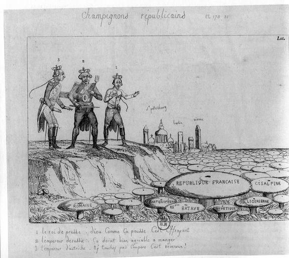 | Keywords: ChampRep.jpg  champignons républicains republican i e revolutionary mushrooms - French political caricature a 1799 The monarchies of Europe personified by the rulers Russia Prussia and Austria and their capitals Saint Petersburg Berlin and Vienna watch how after the rise of the French First Republic all over Europe republics with French support spring up like mushrooms The Prussian king exclaims 'God how quick they rise it's frightening ' The Russian tsar says fork and knife ready 'That will be nice to eat ' The Austrian emperor warns him 'Don't touch them godfather they are poisonous ' The Russian tsar has only recently joined the Second Coalition against France 1798 and hungers for conquest whilst both German princes have already learnt their lesson after their many defeats in the War of the First Coalition 1792 “1797 champignons républicains republikanische d h revolutionäre Champignons - Politische Karikatur aus Frankreich um 1799 Die Monarchien Europas ihre Herrscher und Hauptstädte St Petersburg Berlin und Wien sind von einem Meer neuer Republiken umgeben Namentlich in der Mitte die grosse französische Mutterrepublik um sie herum v l n r die kleinere römische parthenopeische batavische helvetische ligurische und cisalpinische Tochterrepublik Die Karikatur spielt bildhaft mit dem im Französischen wie im Deutschen gängigen Sprichwort Wie die Pilze aus dem Boden schiessen Der König von Preussen sagt Gott wie das Zeug aus dem Boden schiesst entsetzlich ; der russische Zar Das gäbe eine ziemlich leckere Mahlzeit ab ; der österreichische Kaiser Nicht anfassen Gevatter das ist giftig Der russische Zar noch nicht lange in die antifranzösische Kriegskoalition eingetreten hat Appetit auf Eroberungen wogegen die beiden deutschen Fürsten nach den vielen Niederlagen seit 1792 ihre Lektion bereits gelernt haben champignons républicains republikeinse d w z revolutionaire paddenstoelen Op deze Franse politieke karikatuur uit 1799 kijken de monarchieën van Europa verpersoonlijkt door de vorsten van Pruisen Oostenrijk en Rusland en hun hoofdsteden Sint-Petersburg Berlijn en Wenen toe hoe in navolging van de Eerste Franse Republiek overal in Europa met Franse steun republieken als paddenstoelen uit de grond schieten De Pruisische koning roept uit 'God wat schieten ze snel omhoog angstaanjagend ' De Russische tsaar zegt met vork en mes in de aanslag 'Dat zal lekker zijn om op te eten ' De Oostenrijkse keizer waarschuwt 'Raak ze niet aan peetvader ze zijn giftig ' De Russische tsaar heeft zich pas net aangesloten bij de Tweede Coalitie tegen Frankrijk 1798 en heeft veroveringshonger terwijl de beide Duitse vorsten na de vele nederlagen in de Eerste Coalitieoorlog 1792 “1797 hun lesje inmiddels geleerd hebben PD-old Caricatures of France Caricatures on the French Revolution Proverbs in art |