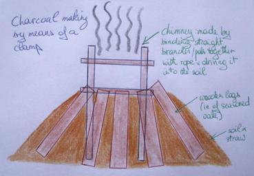 Keywords: Charcoal clamp.JPG en A schematic of a clamp Wooden logs are about 1 3m high and width between the stakes of the chimney is about the length of a stretched arm 70cm own KVDP 2010-02-15 Cc-zero Charcoal piles