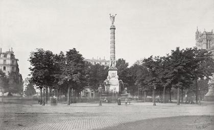 Keywords: Charles Marville, Place du Châtelet 2, ca. 1853–70.jpg Photograph en Looking across paved square towards the Fontaine du Palmier showing a bronze column mounted with a winged Victory holding up laurels and other decoration celebrating Napoleons' victories in Egypt base decorated with sphinxes; avenue of trees surrounding fountain depicted people depicted place Place du Châtelet Paris France circa 1853 “70 photographic print mounted on cardboard albumen silver 22 6 x 37 0 cm Institution State Library of Victoria accession number H88 19/75b SLVIC-digitalimage 122764 H88 19/75b object history exhibition history credit line Gift; Government of France; 1880 Photographer unknown but probably Charles Marville Undated dates assigned from time of Haussman's renovation of Paris Title hand inscribed on label adhered to portfolio page beneath image Information field In collection Photographic views of Paris PD-100 Place du Châtelet Paris Fontaine du Palmier Historical images of Tour Saint-Jacques Charles Marville - Photographic views of Paris Images of Paris from the State Library of Victoria Monuments and memorials to Napoleon I of France