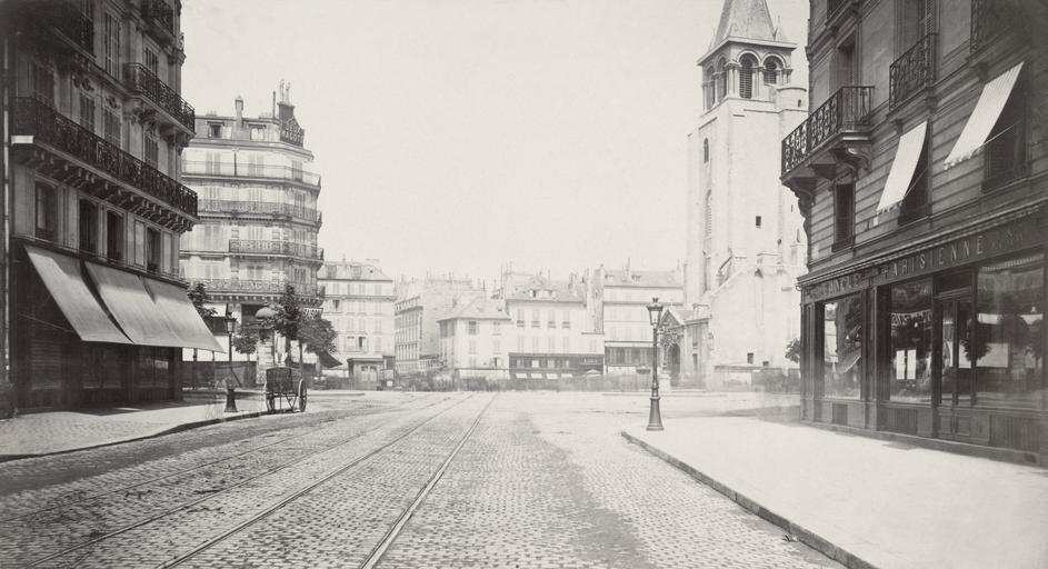 Keywords: Charles Marville, Place Saint Germain des Prés, de la rue de Rennes, ca. 1853–70.jpg Photograph en Looking along wide cobbled street with tram lines running the length of the street the tower of the Abbey of St Germain des Prés visible on right depicted people depicted place Place Saint-Germain-des-Prés Paris France circa 1853 “70 photographic print mounted on cardboard albumen silver 32 x 26 cm Institution State Library of Victoria accession number H88 19/85b SLVIC-digitalimage 122770 H88 19/85b object history exhibition history credit line Gift; Government of France; 1880 Photographer unknown but probably Charles Marville Undated dates assigned from time of Haussman's renovation of Paris Title hand inscribed on label adhered to portfolio page beneath image Information field In collection Photographic views of Paris PD-100 Place Saint-Germain-des-Prés Paris Rue de Rennes Paris Historical images of Abbaye de Saint-Germain-des-Prés Charles Marville - Photographic views of Paris Images of Paris from the State Library of Victoria |