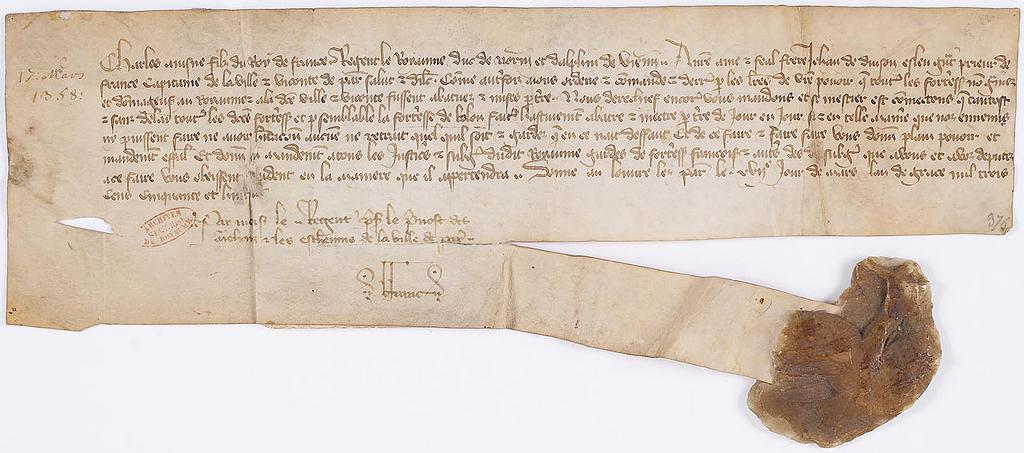 Keywords: Charles, régent du royaume demande à Jean de Duison de faire abattre Toutes les forteresses qui pourraient nuire au royaume et à la ville de Paris, notamment... - Archives Nationales - AE-II-376.jpg Charles régent du royaume demande à Jean de Duison grand prieur des hospitaliers de France capitaine de la ville et de la vicomté de Paris de faire abattre Toutes les forteresses qui pourraient nuire au royaume et à la ville de Paris notamment celle de Bolon Mandement donné au Louvre 17 mars 1359 1359-03-17 parchment Institution Archives nationales France AE/II/376 object history exhibition history credit line Archives Nationales cooperation project PD-old-100-1923 accession number AE/II/376 K//948/40 Collections of Archives nationales France 1359 in FranceMedia contributed by the Archives Nationales France /5 Charles V of France